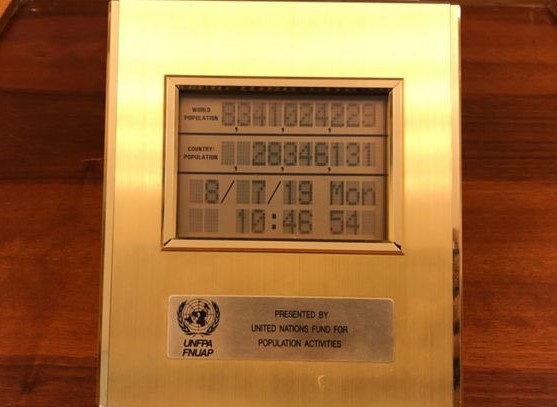 Сат који мери рођење сваког новог становника Земље тада је у престоницу СФРЈ као поклон донео генерални секретар УН Хавијер Перез де Куељар Гера и он без престанка, са незнатним одступањем, ради 34 године, а све време се налази у Палати Србије.