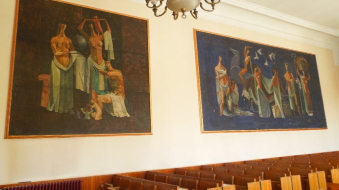 А у самој згради, десни зид скупштинске сале од шездесетих година красе две фреске огромних димензија, ”Врзино коло” из 1959. на више од 21 квадрата, мера 324 са 653 центиметара, и ”Женски акт” од 324 са 320 центиметара из 1964. године, које је академски сликар Ђурђе Теодоровић поклонио Земуну.